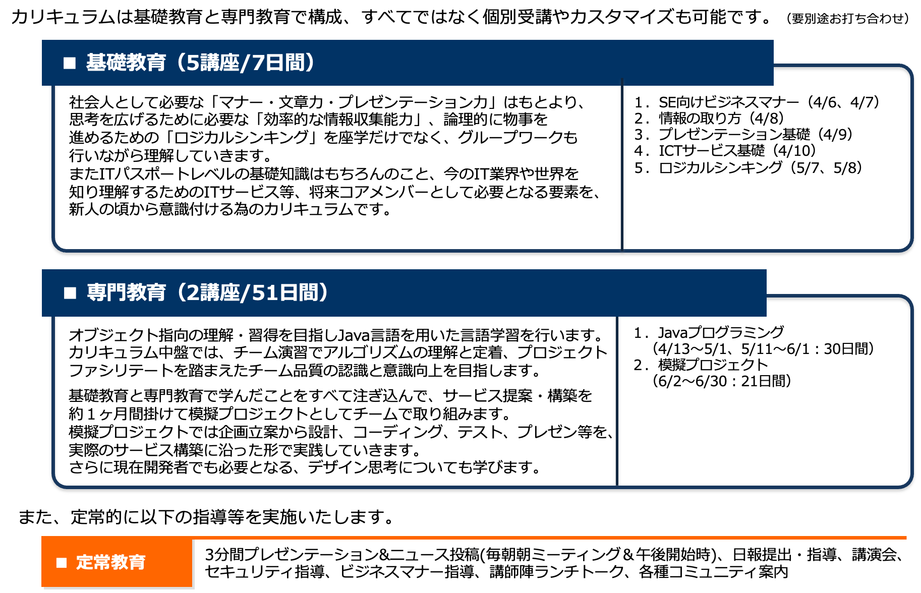 - 3ヶ月間が難しい場合、基礎教育のみや1講座のみのカスタマイズ可能