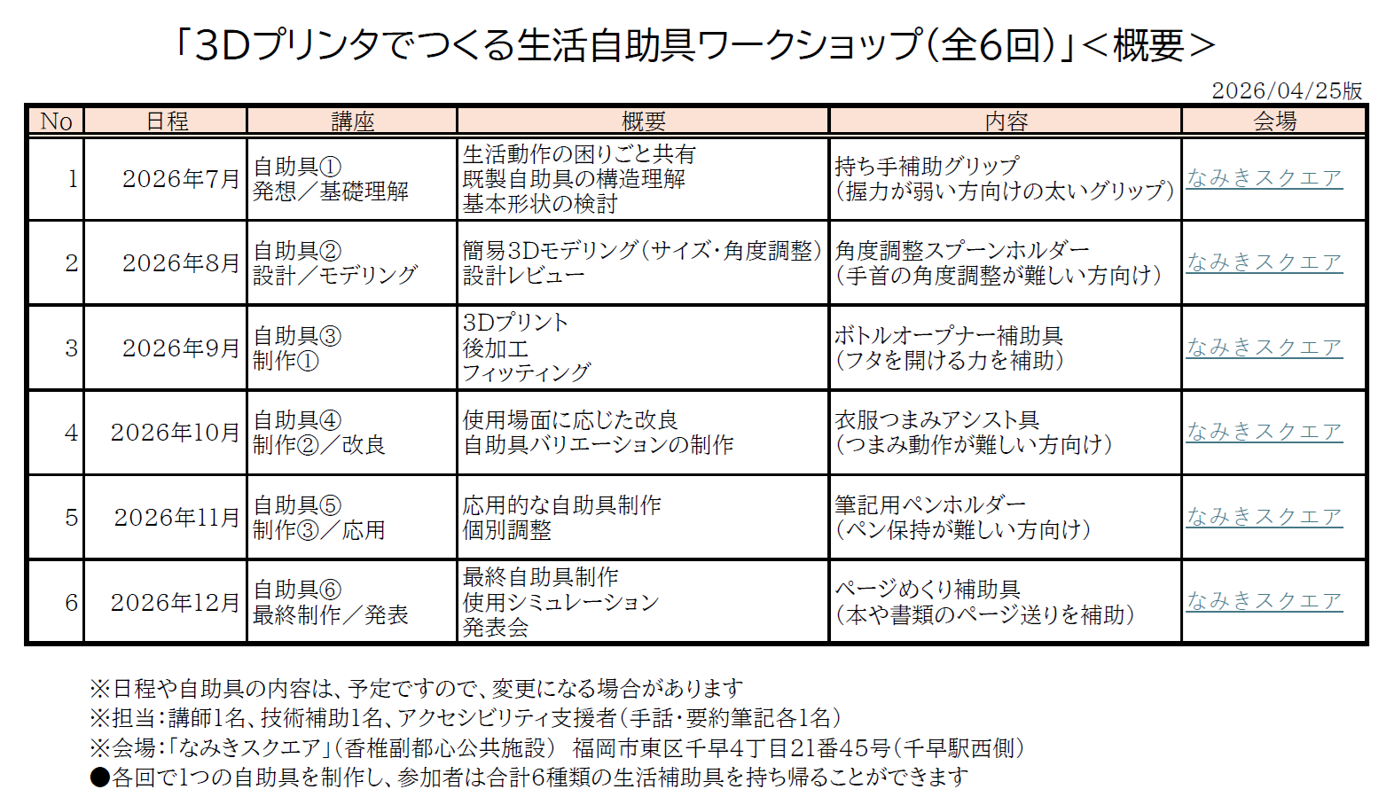 「3Dプリンタでつくる生活自助具ワークショップ(全6回)」<概要>